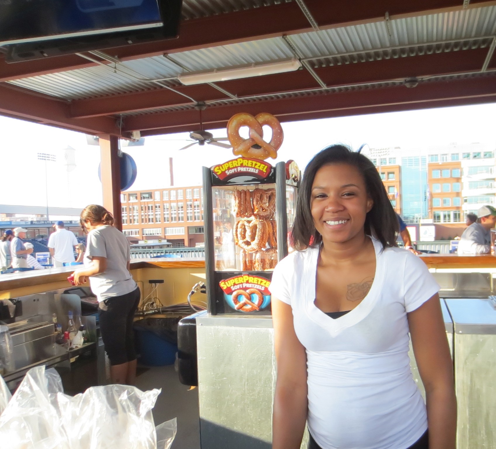 That attitude pervades the entire stadium, where stories abound. Tonight, that story was manifested in the form of Nortica, who currently works at the Jackie Robinson bar that overlooks right field — one of the most beautiful spots to watch a game in North Carolina. Nortica is a Durham native, a Durham Hillside High School graduate, and an overall focused and aggressively optimistic person. She currently holds down two other jobs in addition to her job at the DBAP, and she also is pursuing a degree in criminal justice at nearby North Carolina Central University. She is the proud mother of a 10-month-old, and did I mention that she also is writing a novel about a hard-working young woman who pulls herself up by her bootstraps? Nortica is the Durham Bulls, Nortica is Durham, and, if you think back over many of my entries to this point, Nortica also is minor league baseball. Good luck to her, and thanks to her, too, for reminding me what true grit looks like.