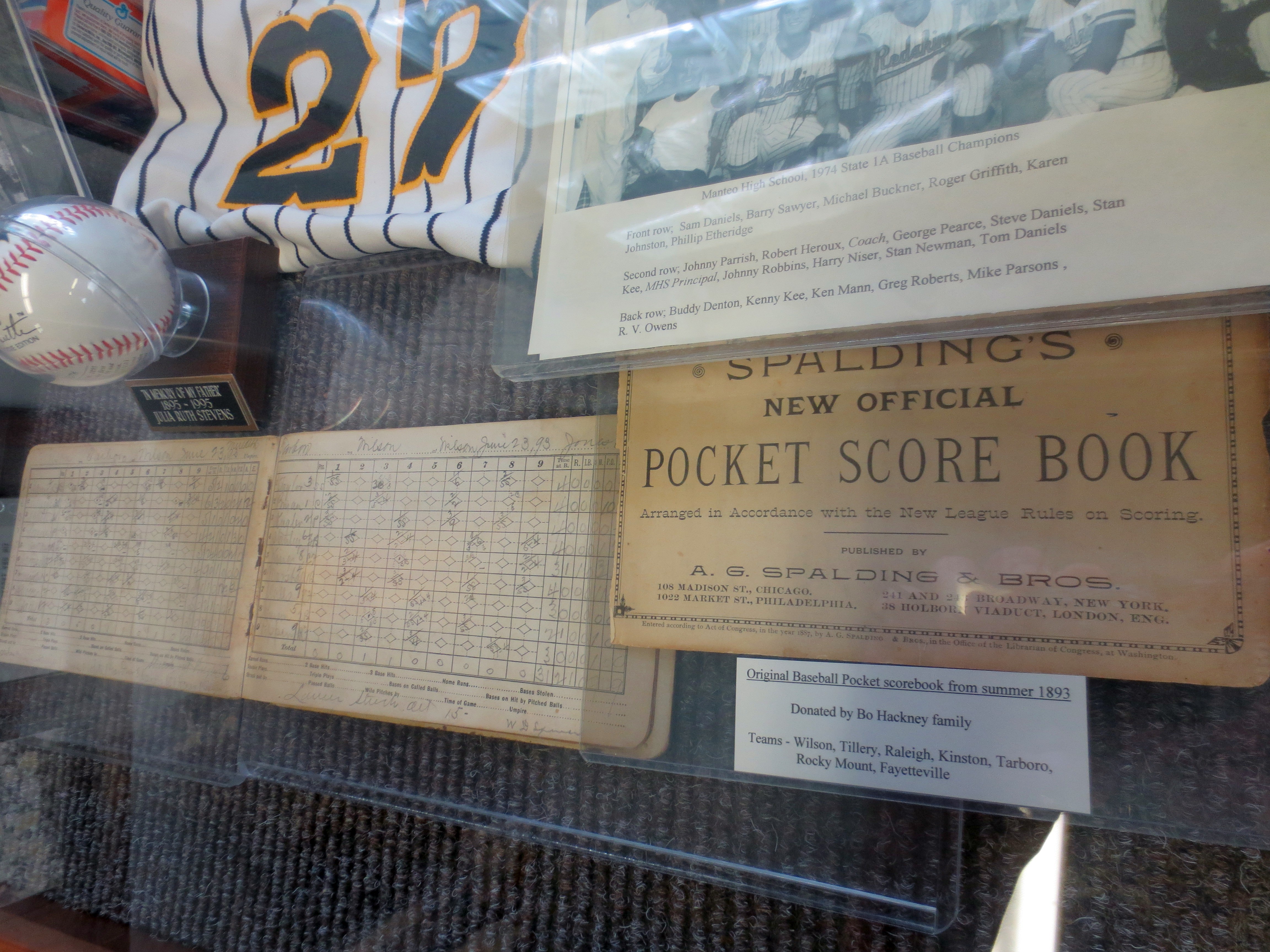 I left for the game early today so that I would have time to stop by the North Carolina Baseball Museum, located in nearby Wilson. Wilson, like so many other small towns across the state without official minor league clubs, hosts an unaffiliated amateur summer league team (the Tobs). The Museum is a spacious, two-room structure that overlooks the Tobs’ field. Walking among its exhibits, you get the feeling that Robin Williams might appear behind your shoulder and whisper — in the ghostly voices of all of the faces that stare out at you from across the centuries in the fading pictures in the display cases — “Carpe Diem.” The Museum’s existence itself is a feel-good story of fan dedication — the brainchild of local restaurateur and North Carolina Hall of Fame inductee Lee Gliarmis and the many citizens and businesses he rallied to fund and create the exhibits on display — almost all of which consist of donated items from personal collections.