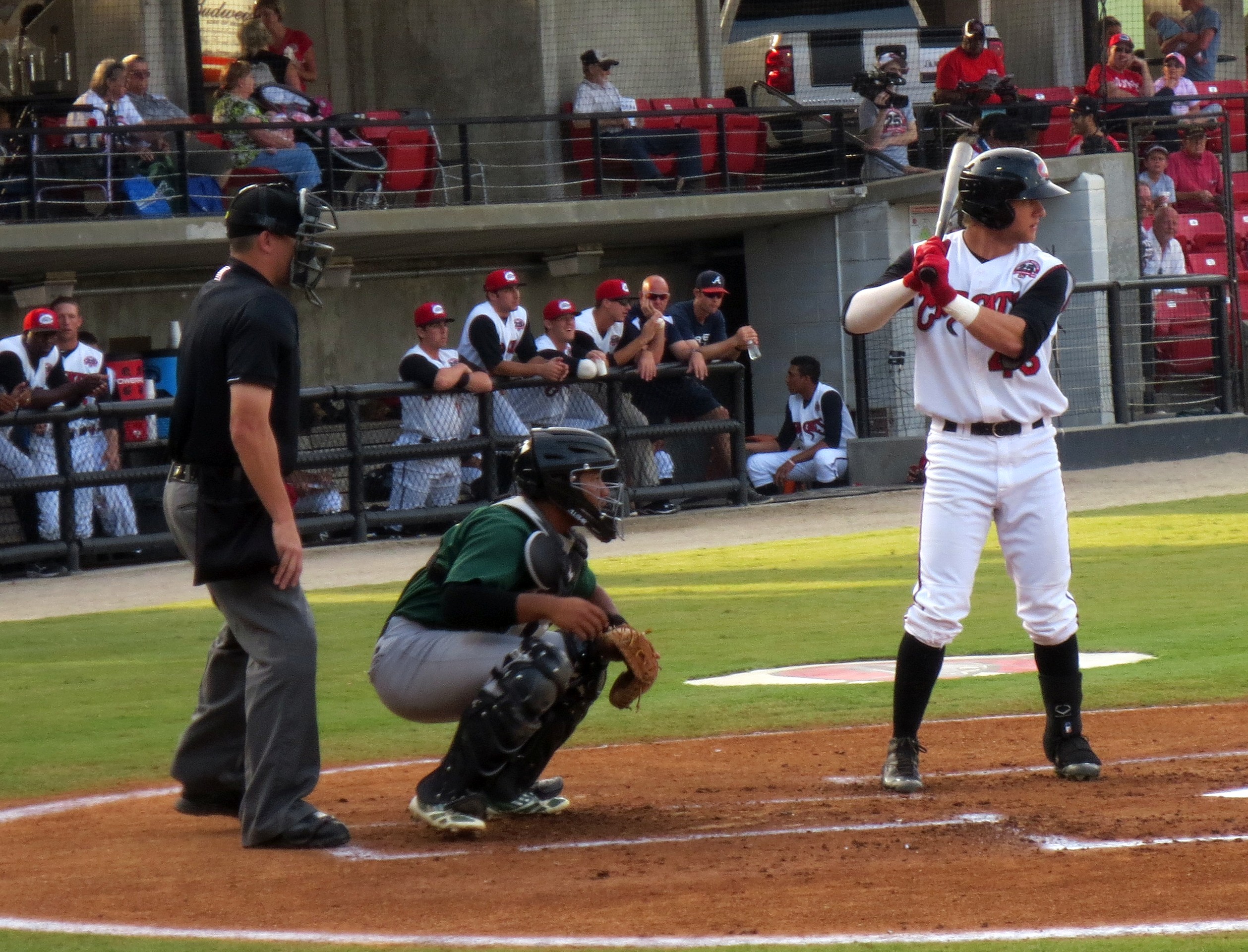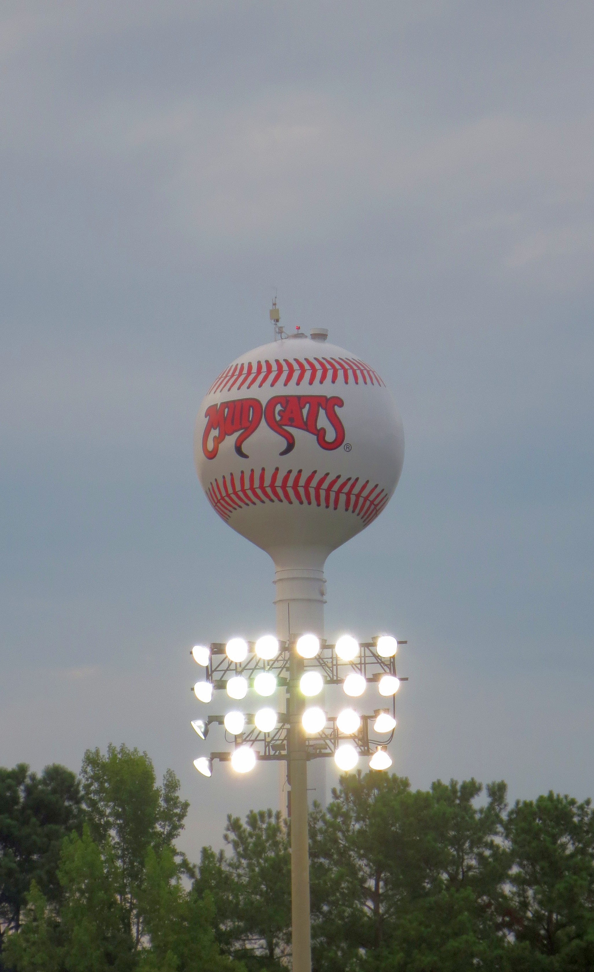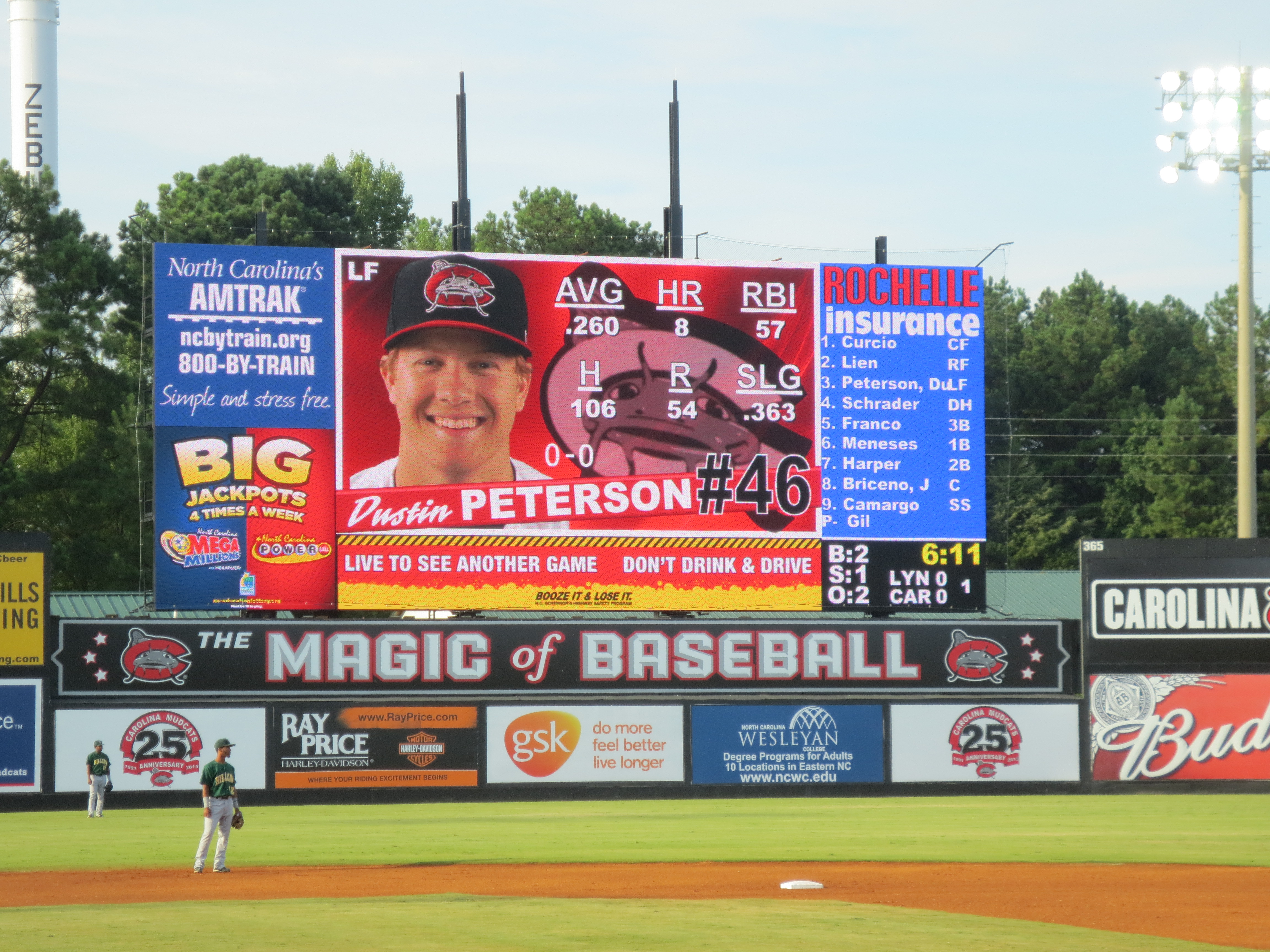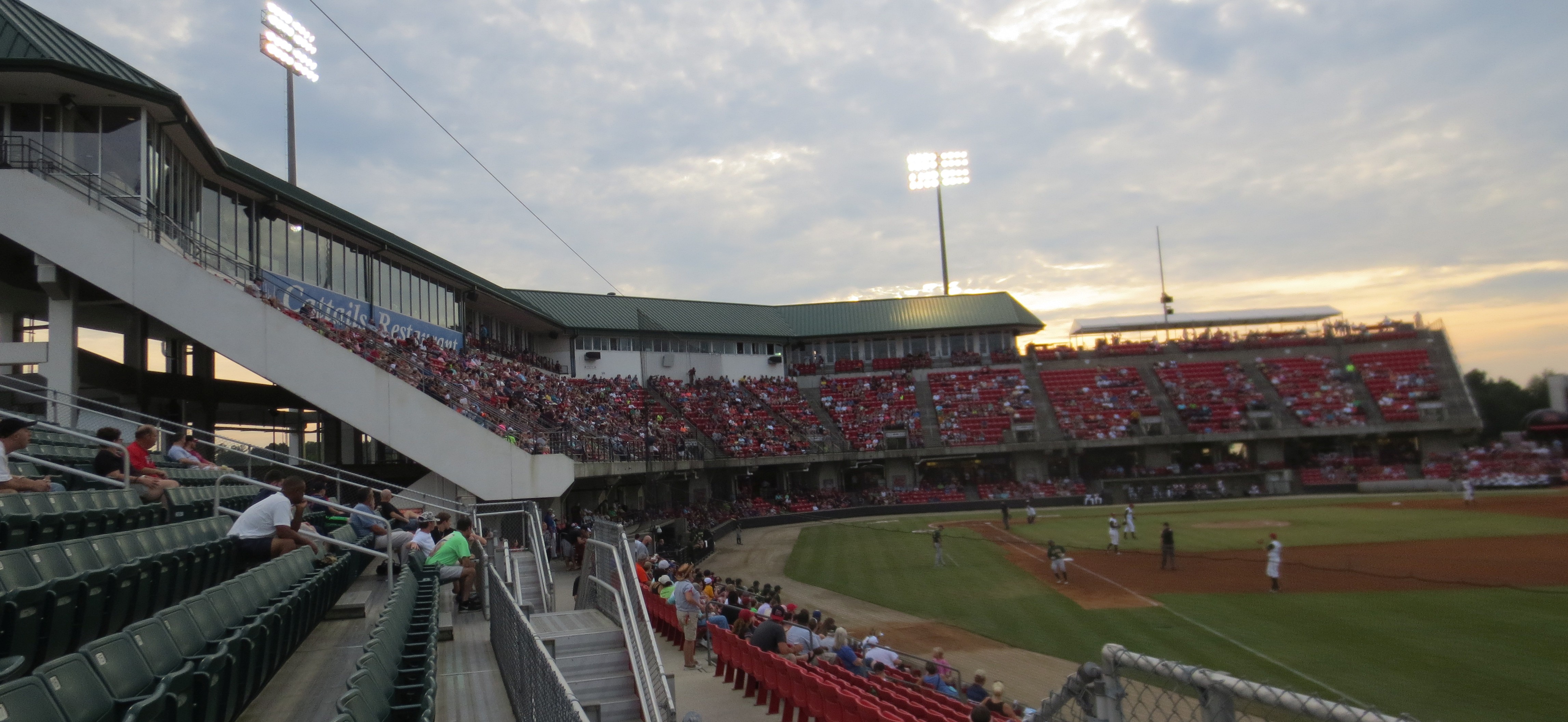 A beautiful night to end a beautiful stretch of games all across North Carolina this week, with no humidity and a large crowd at Zebulon’s Five County Stadium, where the Carolina Mudcats took on the Lynchburg Hillcats. Five County will not win any beauty pageants — it has the feel of a Brutalist-period fallout shelter and is the only stadium I’ve visited in which some of the premium seats have an obstructed view — but because of the angle of the second level, there does not appear to be a bad upper-deck seat in the house. A tightly-sloped deck ensures that even the nosebleed fans are close to the action, and it is hard to top the Cattails Restaurant at the top of the stadium — an upscale spot with a full menu, linen tablecloths, and a panoramic view of the game. Plus, the in-your-face post-game fireworks rivaled even Durham’s powerful display.