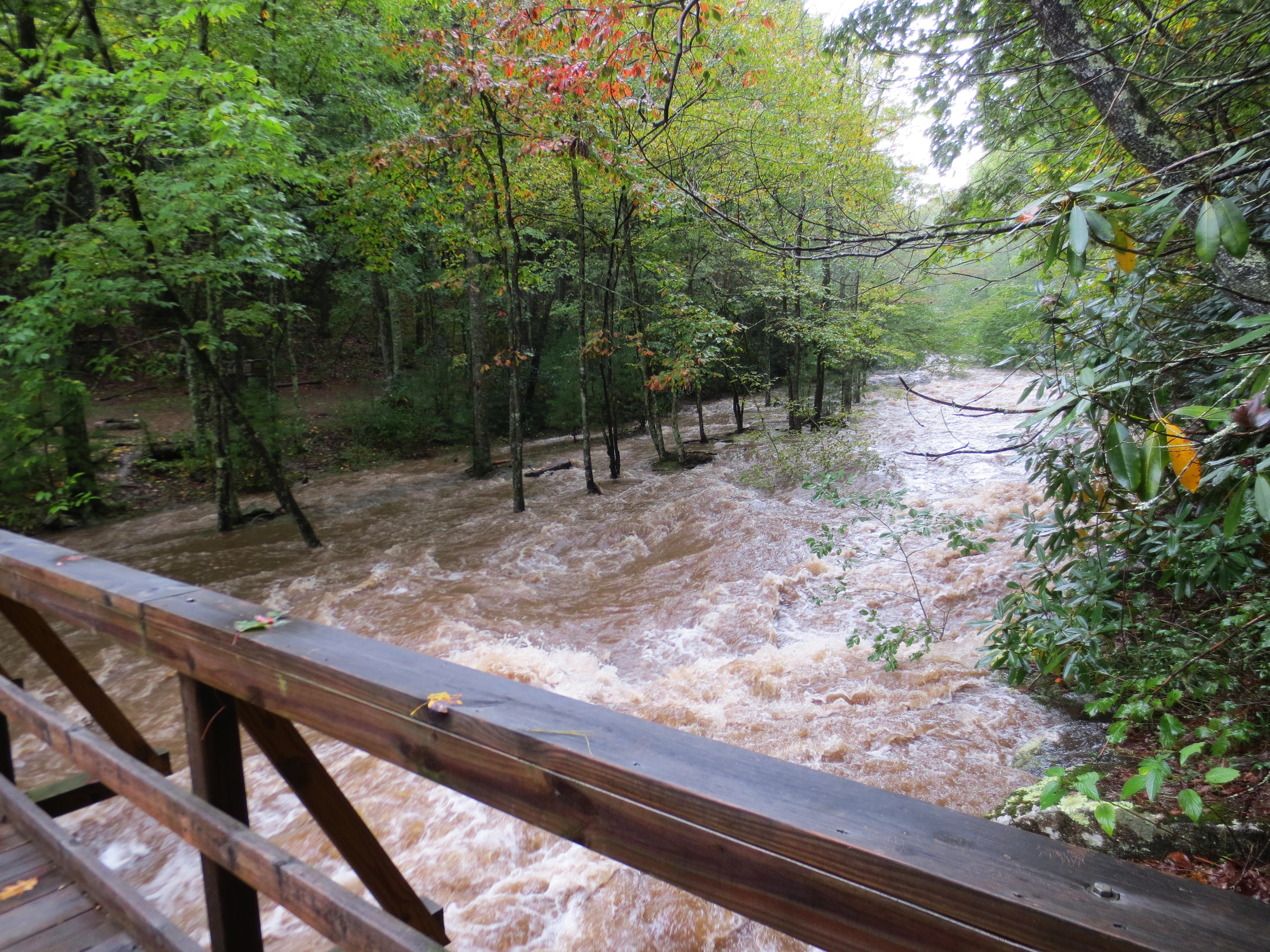 Accommodations: Evergreen Terrace, Deep Gap — Always nice to sleep in your own bed. The service here is a little hit-or-miss, but what it lacks in staff attentiveness it makes up for in the ready availability of snack foods, beer, and ample parking. The most interesting thing about tonight’s accommodations is the raging flood in rain-swollen Laurel Creek. For those of you who have been to Evergreen Terrace before, you may be surprised by the sheer volume of water coursing along the creek’s path — so much water that the bridge over the creek was cut off today from the land on the far side.