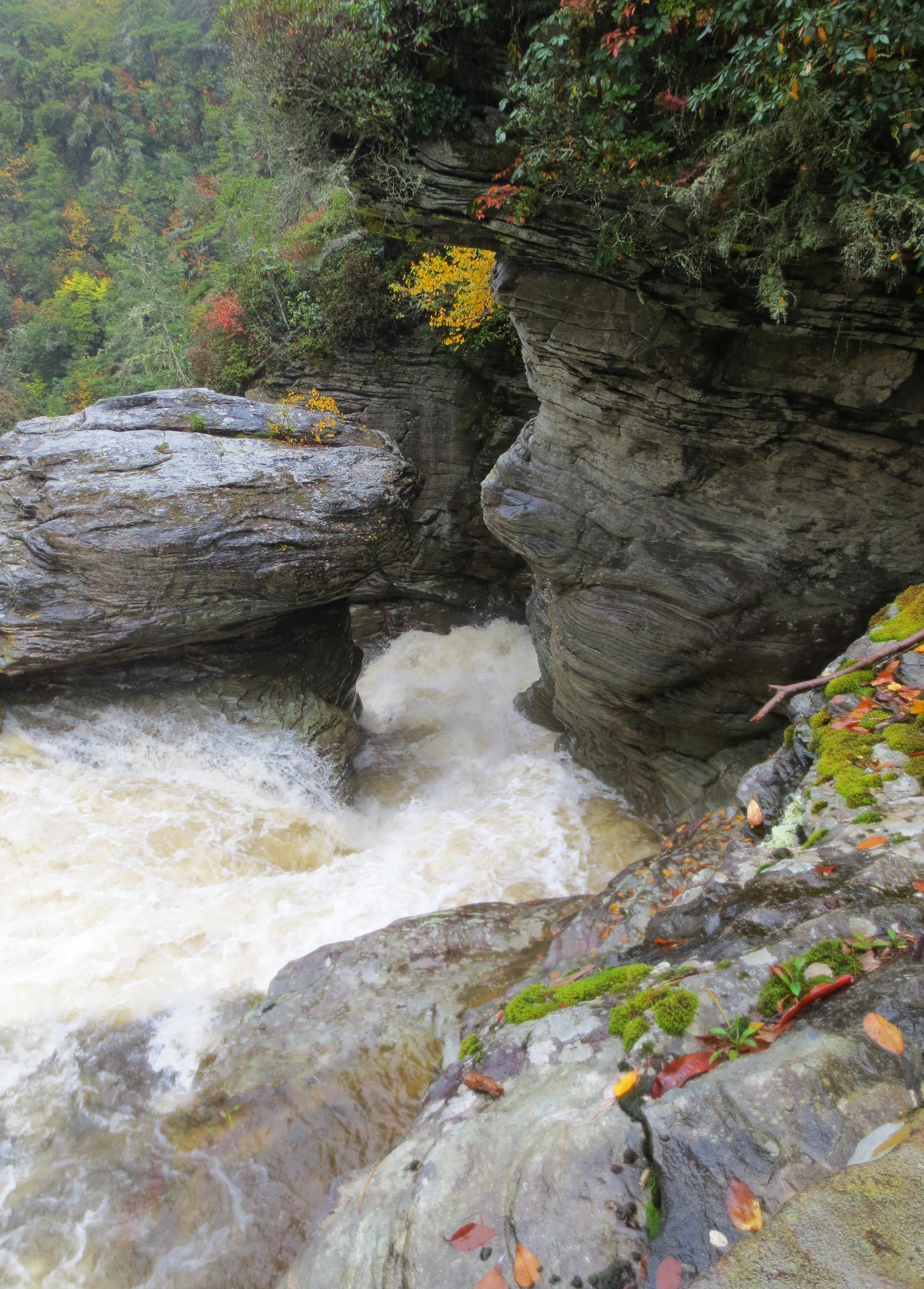 At the first juncture, several paths branch out to various falls and overlooks scattered around the Linville Falls area. I walked down to the lower falls and spent most of my time there listening rather than looking: the river was flooded from all of the recent rain, and the sound as the water arced through the tight rock formations was as loud as a diesel train engine.